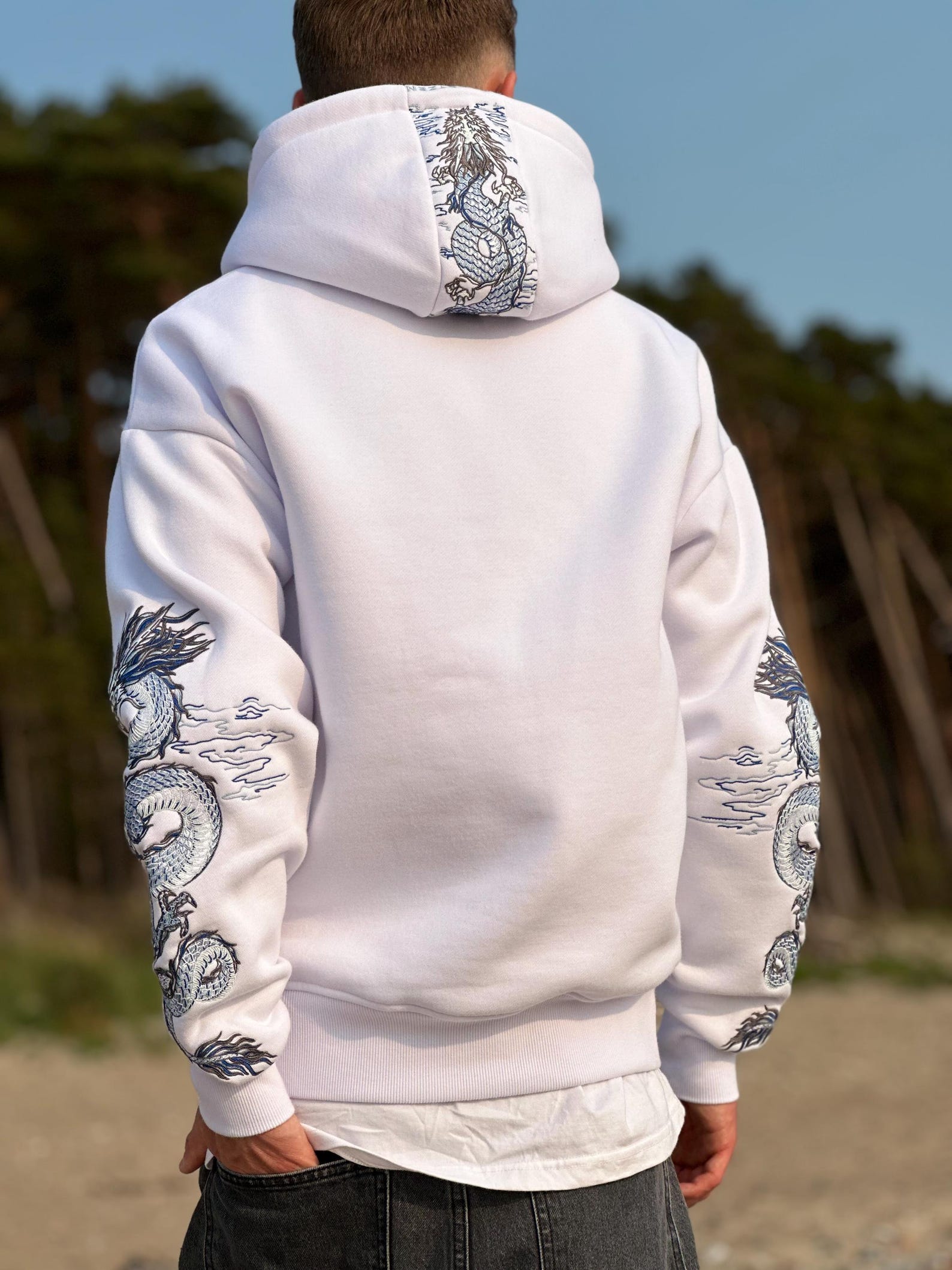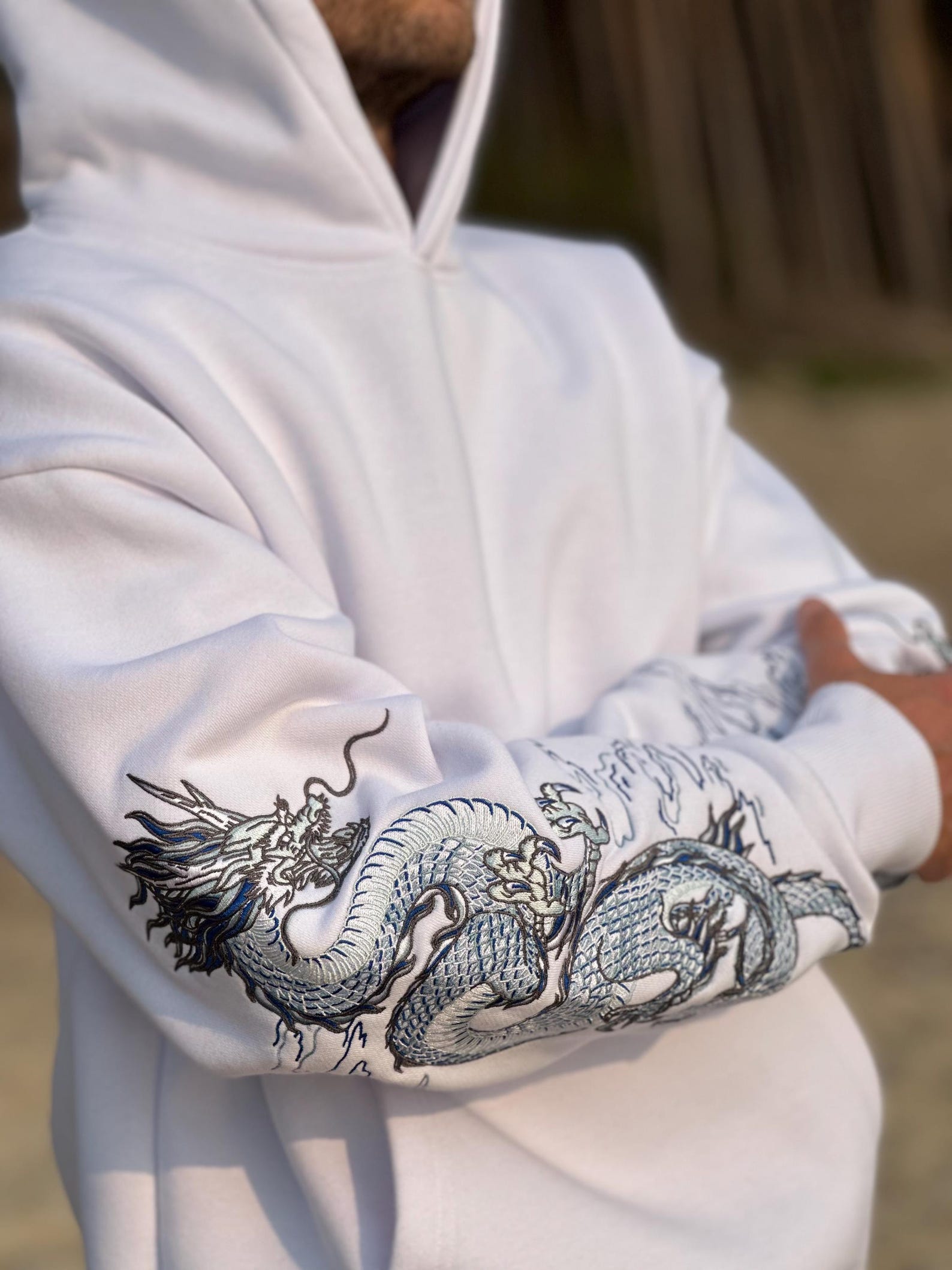 Unleash bold style and timeless craftsmanship with our Embroidered Dragon Cotton Fleece Hoodie, crafted from 100% natural cotton fleece for unmatched comfort and breathability. This piece blends cultural artistry with modern streetwear — featuring dual embroidered dragons cascading along the sleeves and a central hood motif in shimmering silver and blue thread.