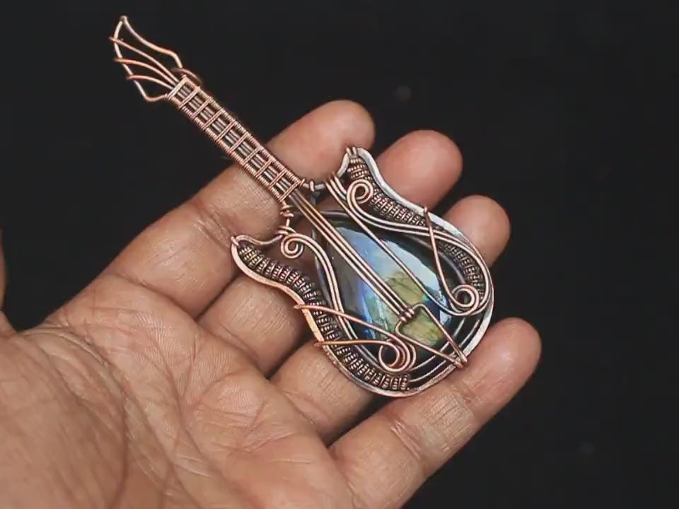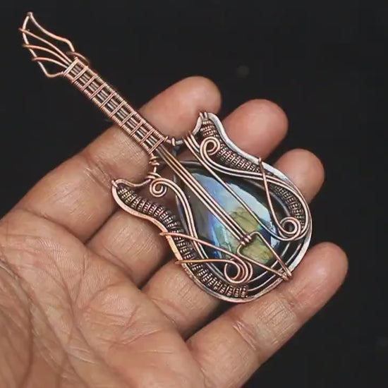 Elevate your jewelry collection with this fabulous Labradorite Guitar Pendant, expertly handcrafted from copper wire in a striking Art Deco design. Featuring a natural Labradorite gemstone with its mesmerizing iridescent hues, this pendant is both a statement piece and a symbol of artistic craftsmanship. Oxidized polish adds a vintage touch, making it perfect for everyday wear or as a unique gift.