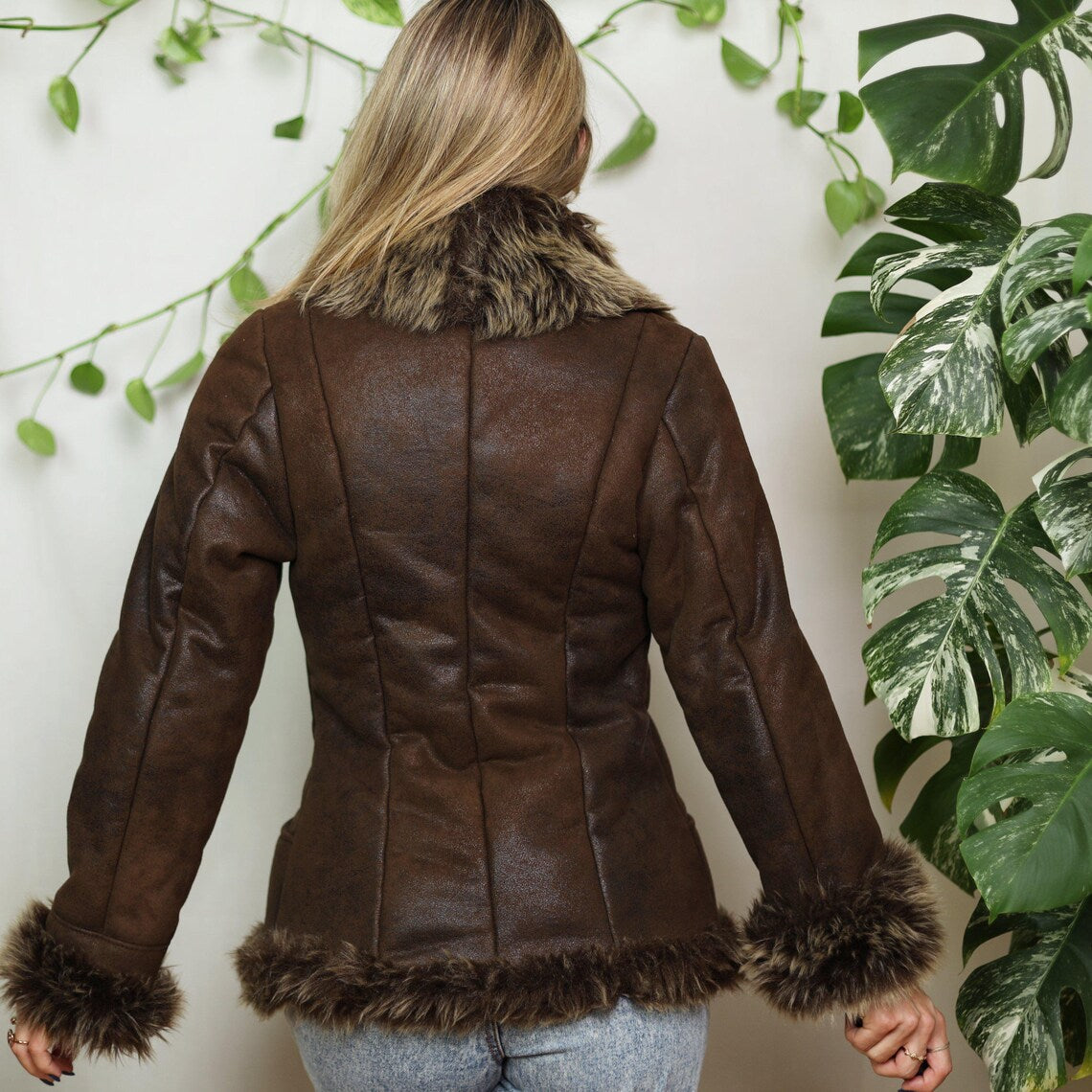 The inside is fully lined with warm synthetic fur, making it both comfortable and stylish for cooler days. A perfect blend of vintage charm and modern craftsmanship, this jacket effortlessly elevates any outfit — from casual jeans to boho dresses.